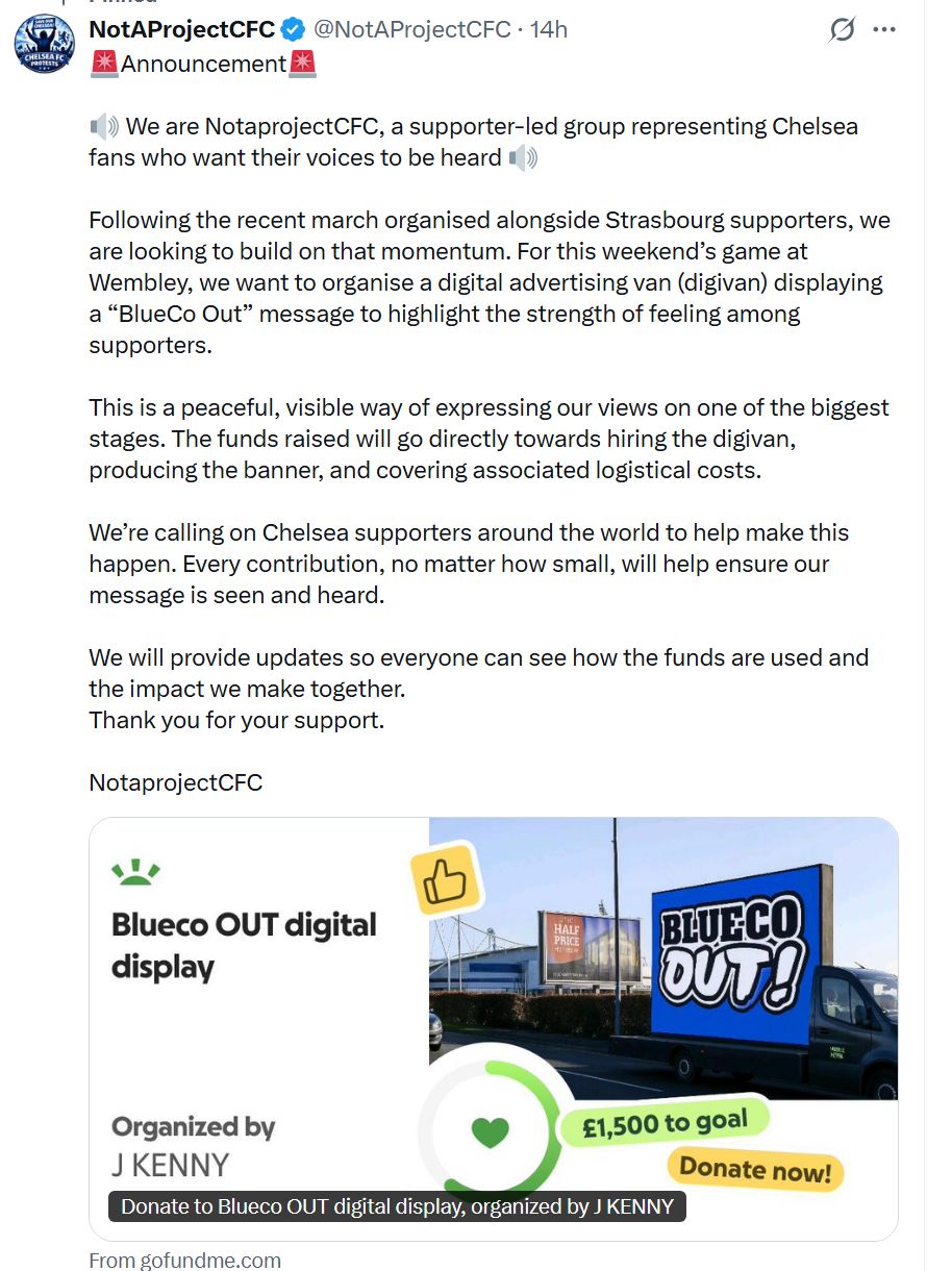 As reported on X, Chelsea fans have raised over £1,500 in less than one hour for the protest group organisers to have a van with the words “BlueCo out” on it to drive around Wembley on Sunday.